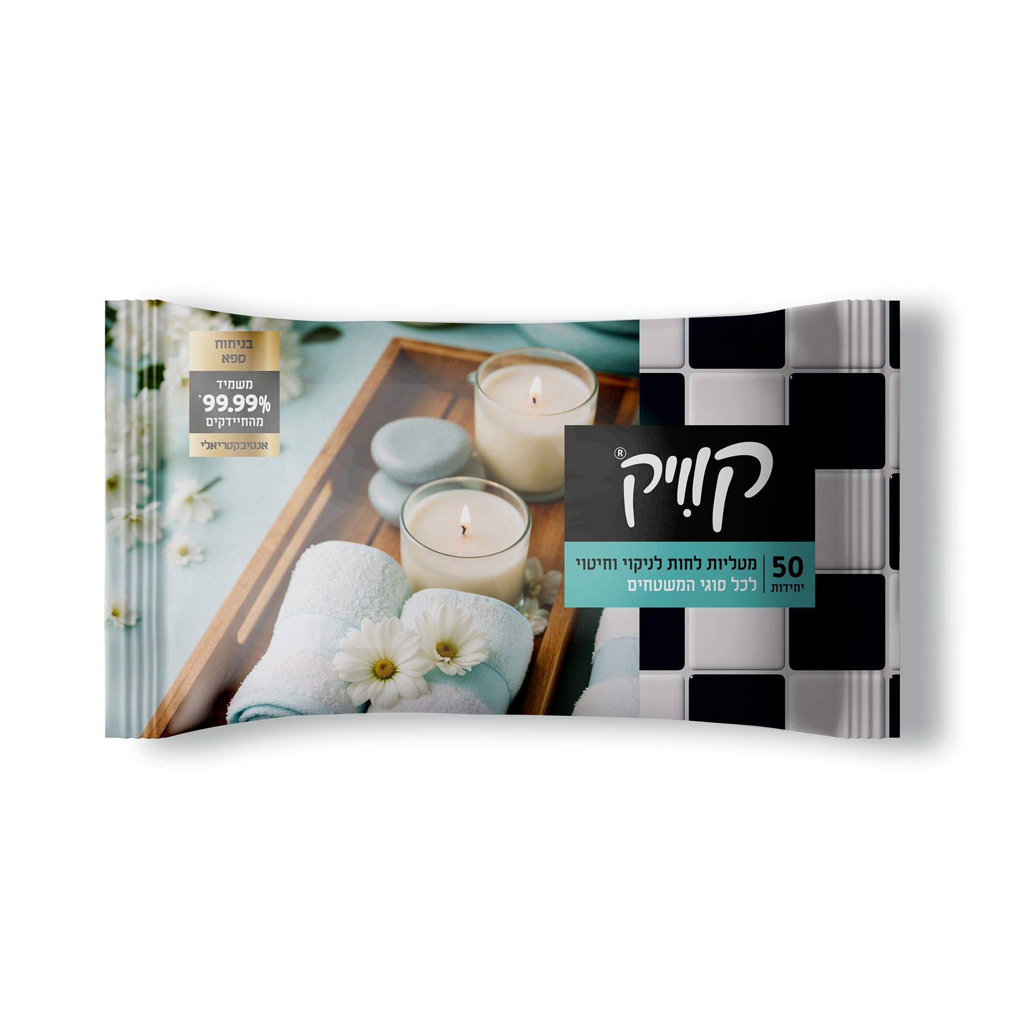 מטליות לחות קוויק חד פעמיות מתאימות לכל סוגי המשטחים, משמידות 99.9% מהחיידקים. בניחוח מלון ספא. 50 יח' במארז